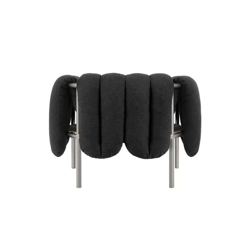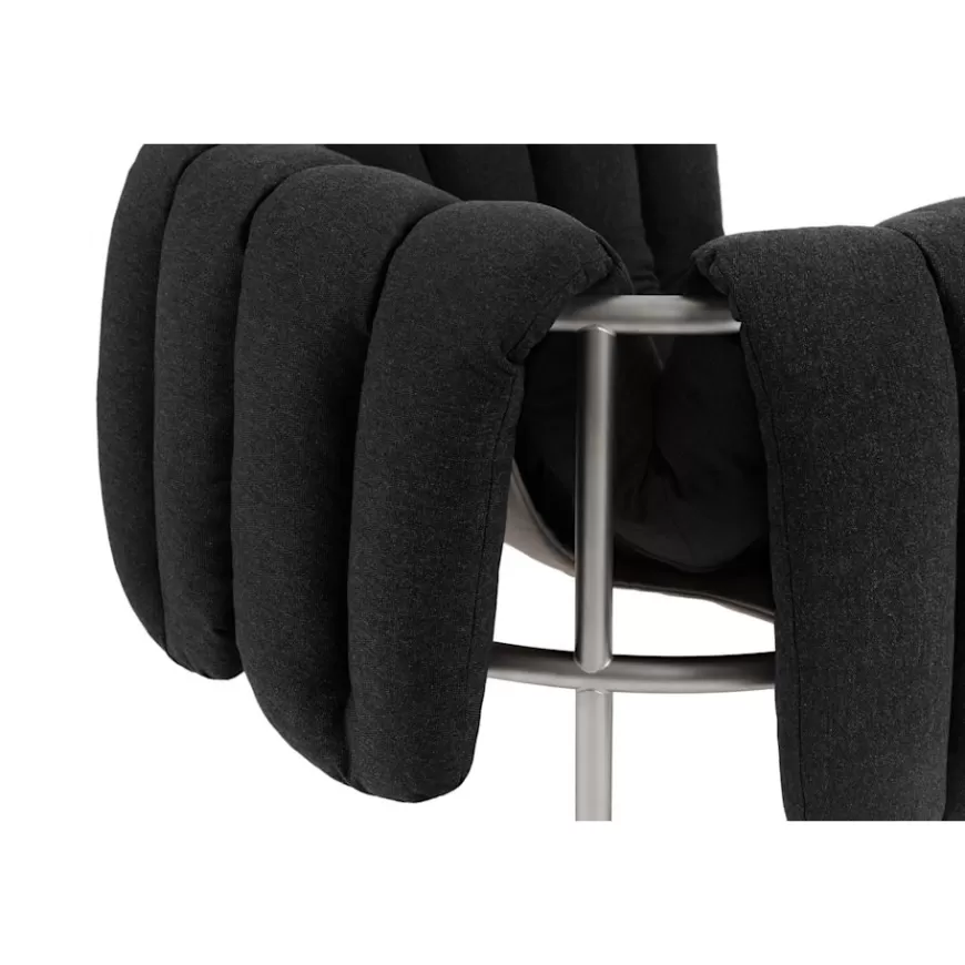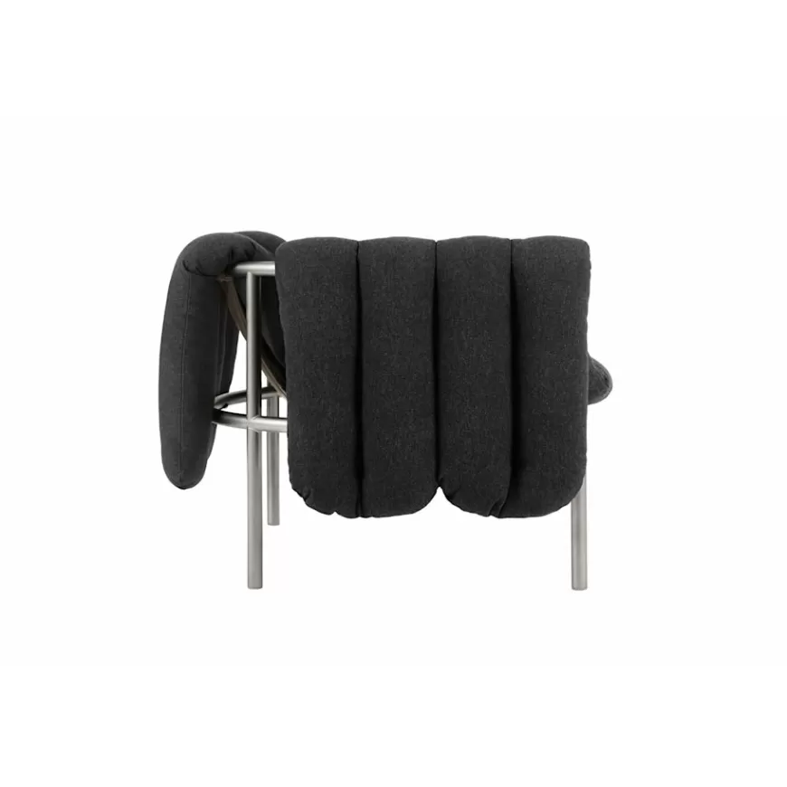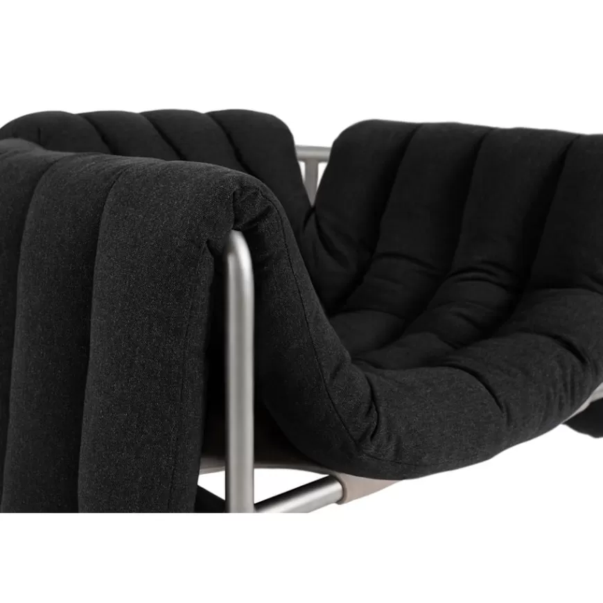 The detachable upholstery of the Puffy Lounge Chair is fat and plump, its generous shape spills freely over the sides of a tubular steel frame which, in stark contrast, is hard-lined and strong. The two key elements of this seating design by Faye Toogood are in purposeful and playful juxtaposition. The elementary frame is inspired by the rational structure of classic modernist design, whilst the extravagant quilt-like upholstery warmly embraces and envelopes, is comforting and reassuring. The Puffy Chair frame is available in powder-coated or sand-blasted steel finishes and a choice of thick canvas, chunky bouclé or luxurious leather upholstery.