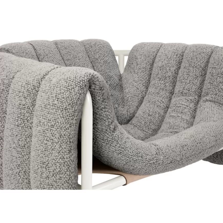 The detachable upholstery of the Puffy Lounge Chair is fat and plump, its generous shape spills freely over the sides of a tubular steel frame which, in stark contrast, is hard-lined and strong. The two key elements of this seating design by Faye Toogood are in purposeful and playful juxtaposition. The elementary frame is inspired by the rational structure of classic modernist design, whilst the extravagant quilt-like upholstery warmly embraces and envelopes, is comforting and reassuring. The Puffy Chair frame is available in powder-coated or sand-blasted steel finishes and a choice of thick canvas, chunky bouclé or luxurious leather upholstery.