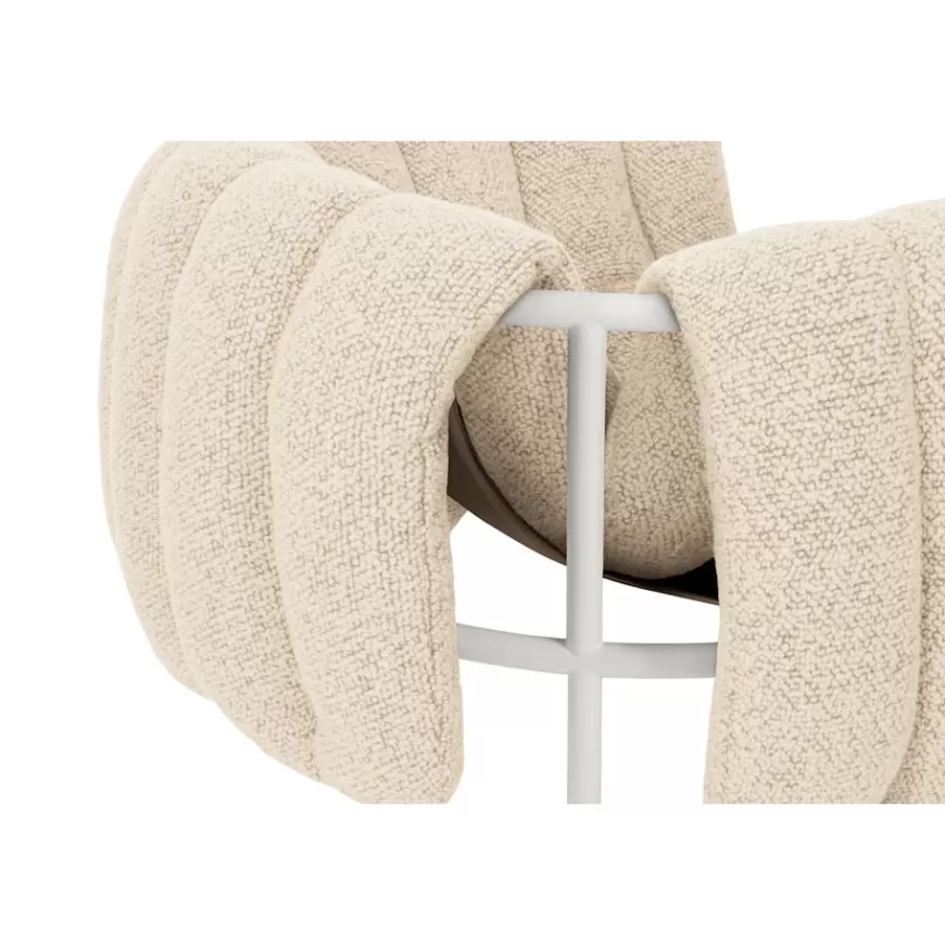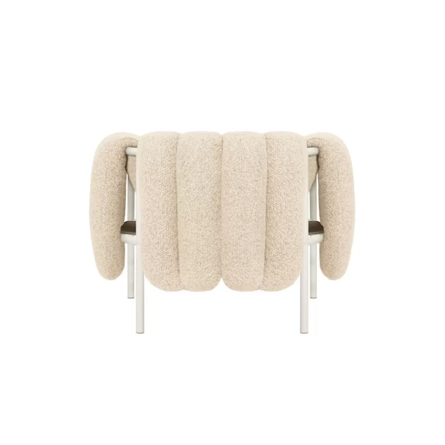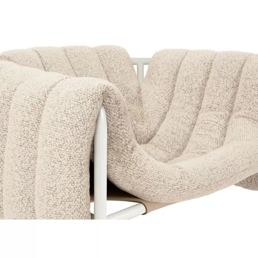 The detachable upholstery of the Puffy Lounge Chair is fat and plump, its generous shape spills freely over the sides of a tubular steel frame which, in stark contrast, is hard-lined and strong. The two key elements of this seating design by Faye Toogood are in purposeful and playful juxtaposition. The elementary frame is inspired by the rational structure of classic modernist design, whilst the extravagant quilt-like upholstery warmly embraces and envelopes, is comforting and reassuring. The Puffy Chair frame is available in powder-coated or sand-blasted steel finishes and a choice of thick canvas, chunky bouclé or luxurious leather upholstery.