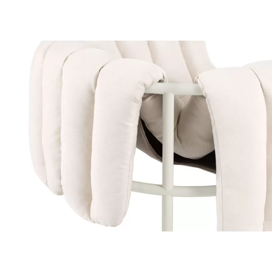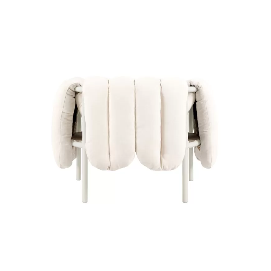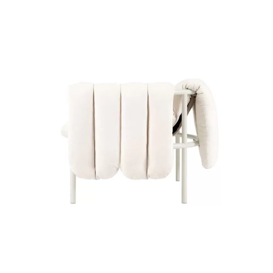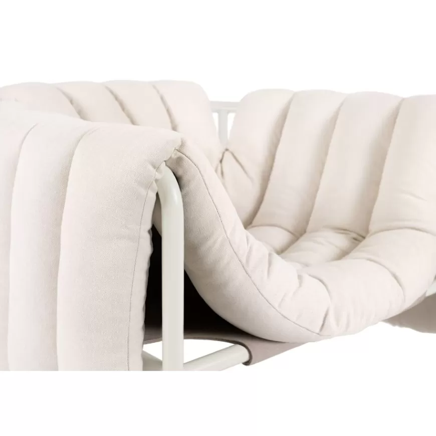 The detachable upholstery of the Puffy Lounge Chair is fat and plump, its generous shape spills freely over the sides of a tubular steel frame which, in stark contrast, is hard-lined and strong. The two key elements of this seating design by Faye Toogood are in purposeful and playful juxtaposition. The elementary frame is inspired by the rational structure of classic modernist design, whilst the extravagant quilt-like upholstery warmly embraces and envelopes, is comforting and reassuring. The Puffy Chair frame is available in powder-coated or sand-blasted steel finishes and a choice of thick canvas, chunky bouclé or luxurious leather upholstery.