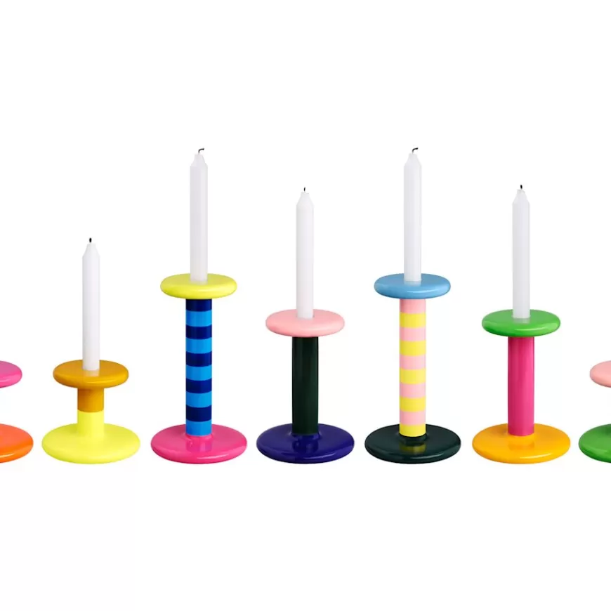 The seductive glossy stripes of the Pesa Candle Holders are hard to resist. Plump inflated features demand to be touched, extreme stature and enticing colorways combine to make an imposing object. The dumbbell shape invites easy maneuvering – move Pesa to wherever it will be most of use or receive most doting adoration. Just like its Molino Grinder sibling, striped decoration has been carefully painted by hand onto a solid beech wood body, each candle holder has a unique and tactile quality. Use Pesa alone, in pairs, or en masse for total graphic impact. This exuberant everyday object from Fabien Cappello is destined to become your most admired interior ornament. Pesa is available in three sizes and multiple colorways.